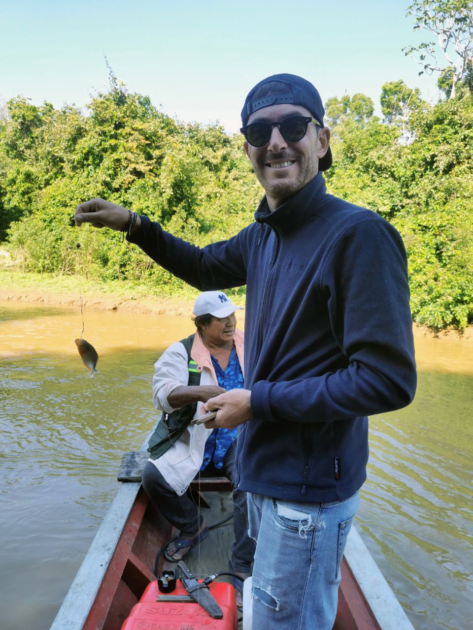 Le lendemain, partie de pêche aux piranhas (quand je vous dis que c’est pas rassurant ces eaux opaques…) ! Il y en avait plein mais c’est très vif et pas si simple à attraper. J’ai quand même réussi à en remonter un ! Qui s’est détaché de l’hameçon dans la barque, Dim l’a chopé à la main pour le remettre à l’eau. Héroïque, moi j’ai eu super peur !
