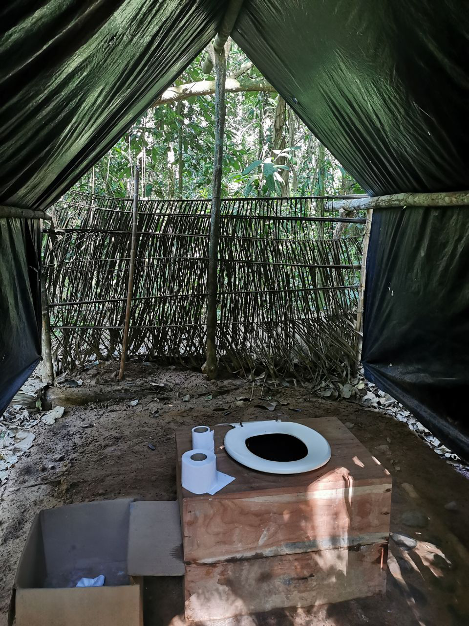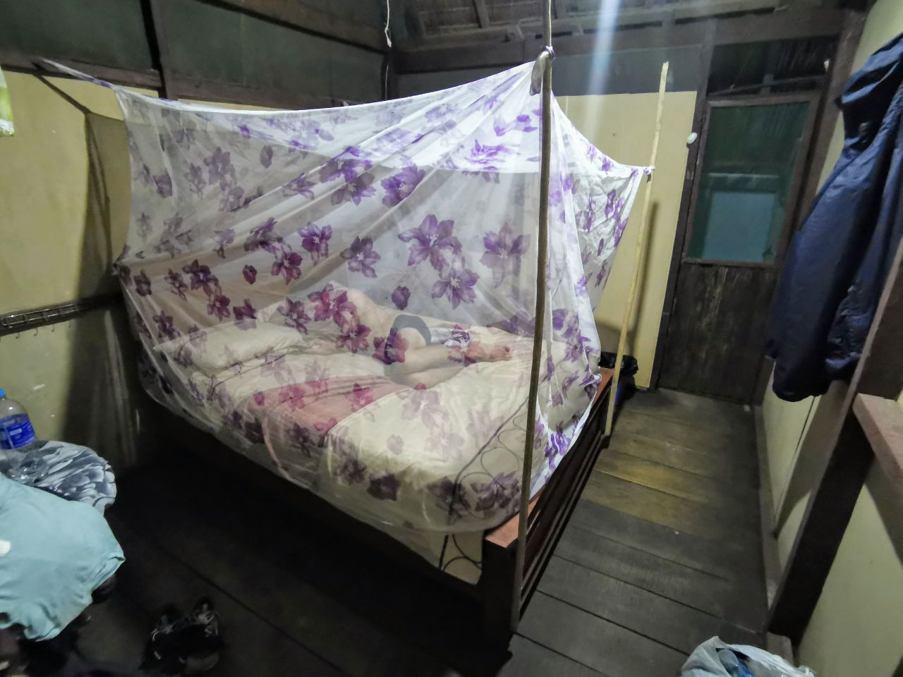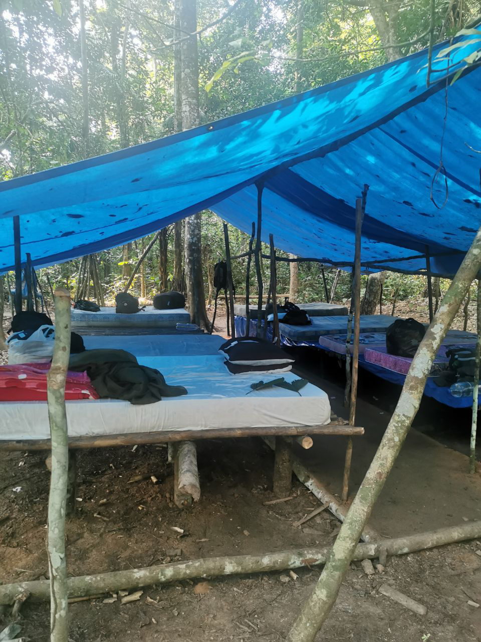 La nuit suivante, on s’enfonce encore un peu plus dans la jungle : notre camp est monté au milieu de rien. Des matelas posés sur des planches en bambou, on tend notre moustiquaire, et c’est tout !