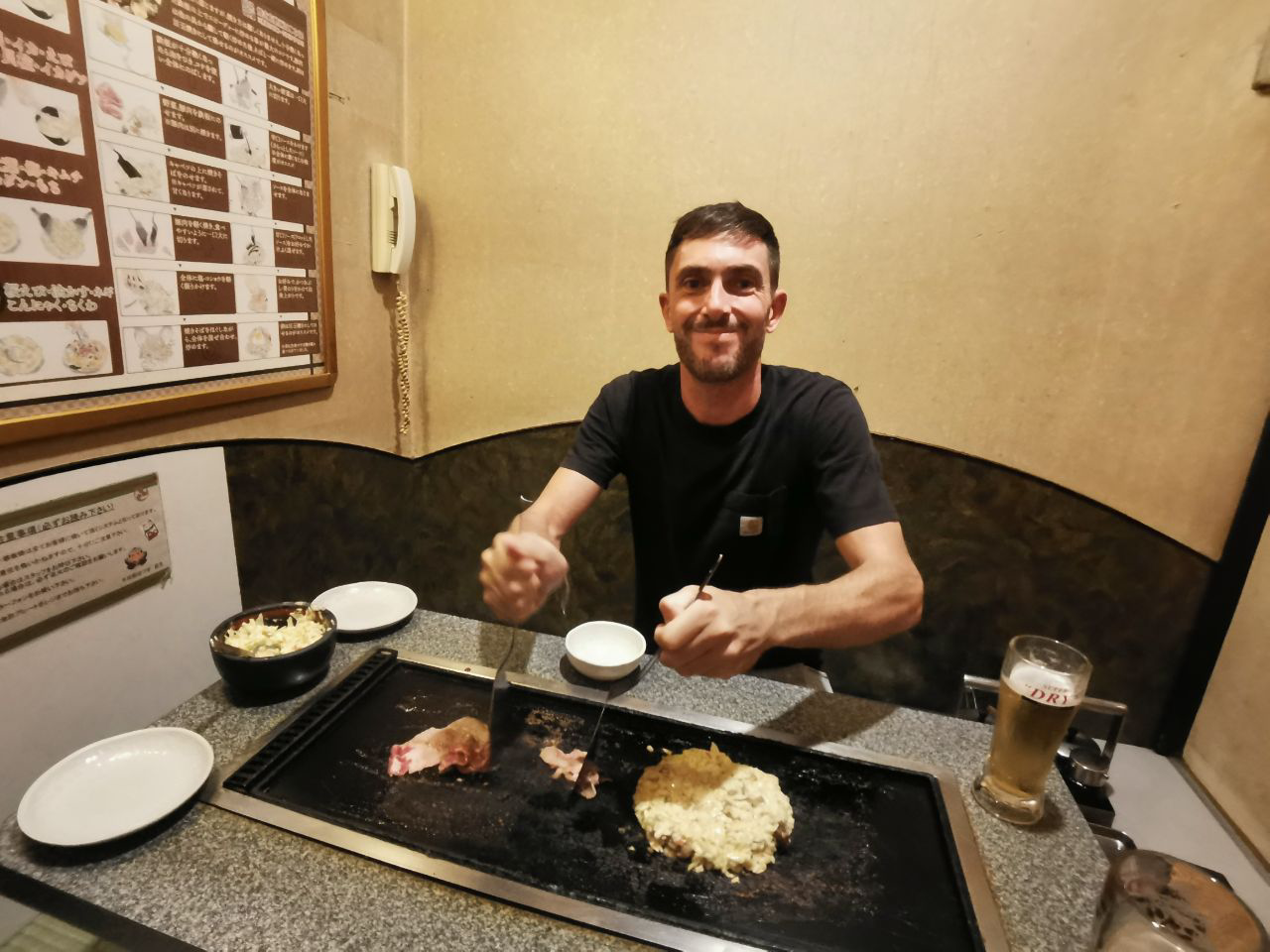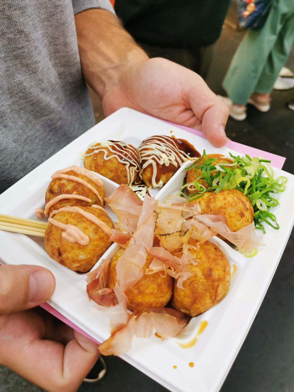 Et enfin, ce qu’on préfère, la nourriture ! On a goûté les traditionnels sushis sur tapis roulant, les ramen, le MacDo (la base)… Sans oublier les spécialités d’Osaka : les takoyaki (boulettes au poulpe) et les okonomiyaki. Un genre d’omelette-pancake à base de viande et légumes. Particularité du resto dans lequel on s’est rendus pour en goûter : on a cuisiné nous-mêmes (bon ok, Dim a cuisiné pour nous deux). Installés dans une espèce de mini-cabine individuelle avec plaque chauffante, fallait pas être claustro (comme dans beaucoup d’endroits ici).