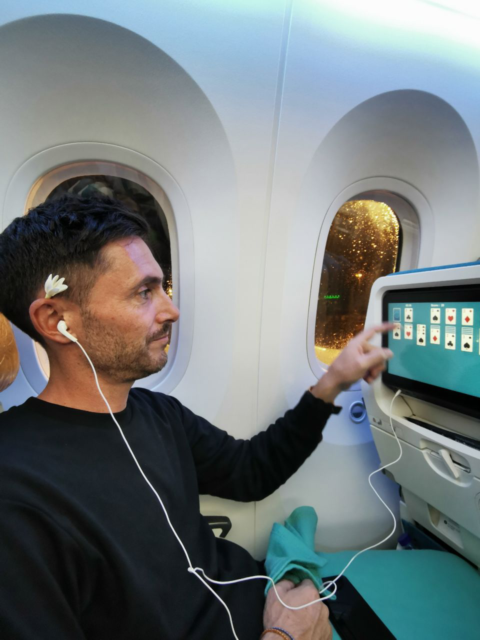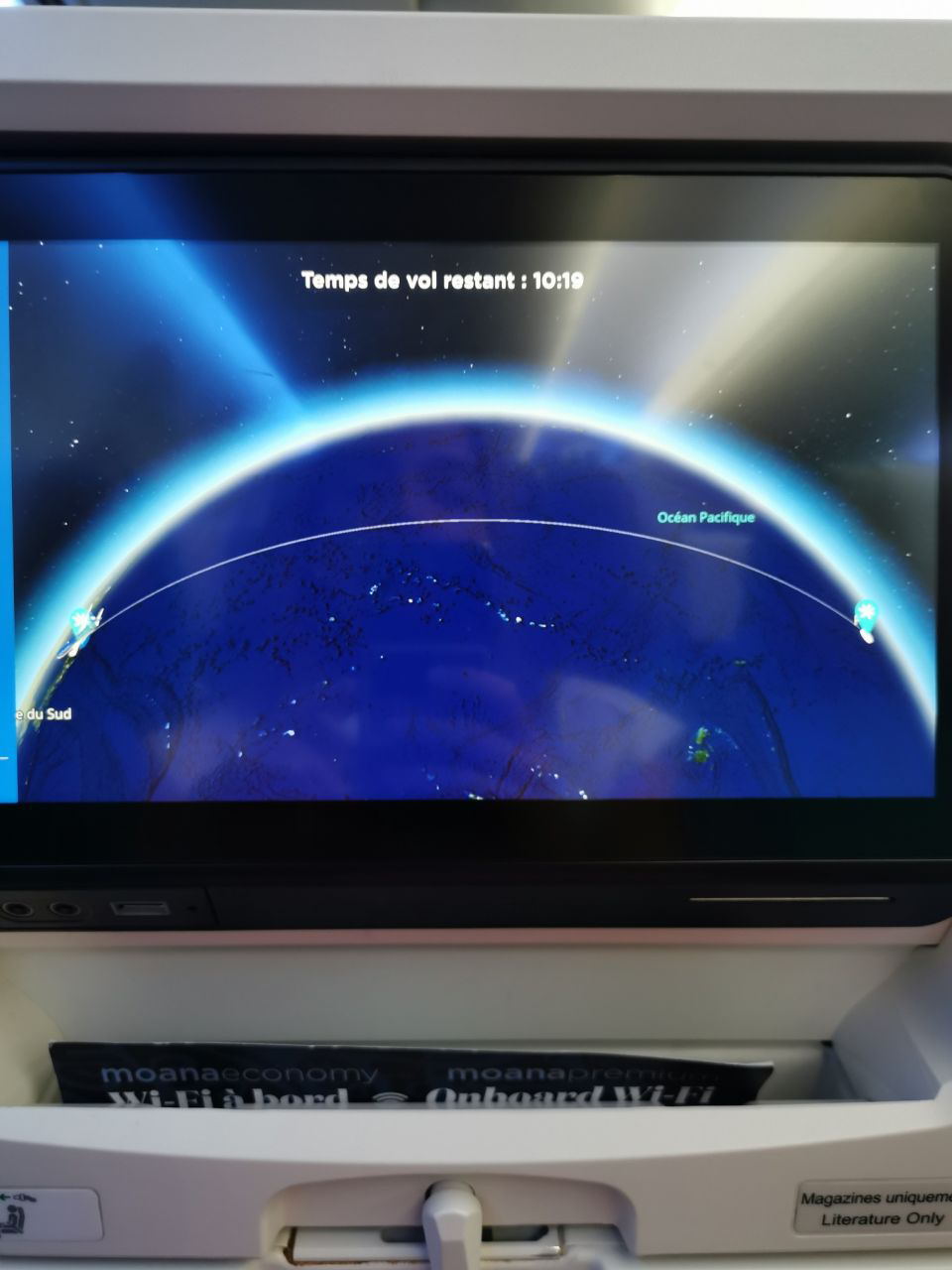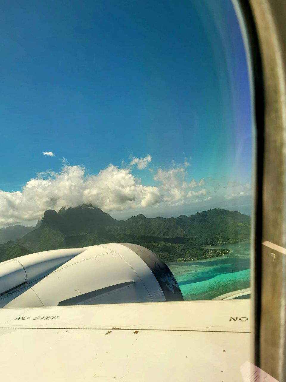 Arrivés au paradis ! Après 11 heures de vol très confortable, nous avons atterri à Papeete, avec une vue du hublot qui fait déjà rêver 🤩 En plus, on a remonté le temps ! Partis du Japon le 7 mai à 20h, arrivés ici le 7 mai à midi ! Qu’il est bon d’arriver à Tahiti et de rajeunir, le tout dans la même journée !