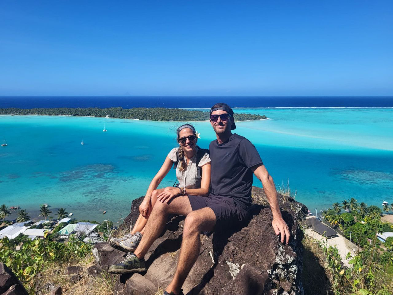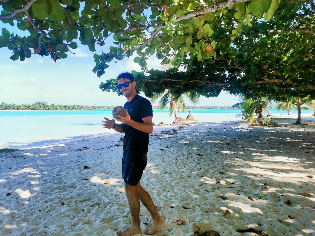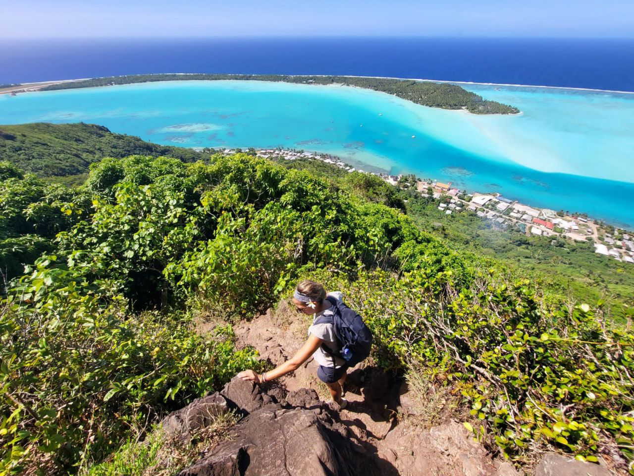Pour quitter notre motu et rejoindre l’île de Maupiti, lorsque le bateau du père n’est pas dispo, il faut ramer, chacun à bord d’un petit kayak. Là aussi, la mer agitée ne nous aide pas dans notre mission (même si on aperçoit quand même les raies!) C’est donc une escapade assez sportive, d’autant qu’on a enchaîné sur l’ascension du Mont Teurafaatiu qui nous régale de panoramas splendides. 1h30 de forte montée dont certains passages se font à l’aide d’une corde. À ce stade c’est davantage de l’escalade que de la randonnée ! J’ai pas osé monter jusqu’au sommet, appréhendant trop la descente, mais Dim, après nous avoir ouvert UN coco sur plage, a su trouver la force d’y parvenir !