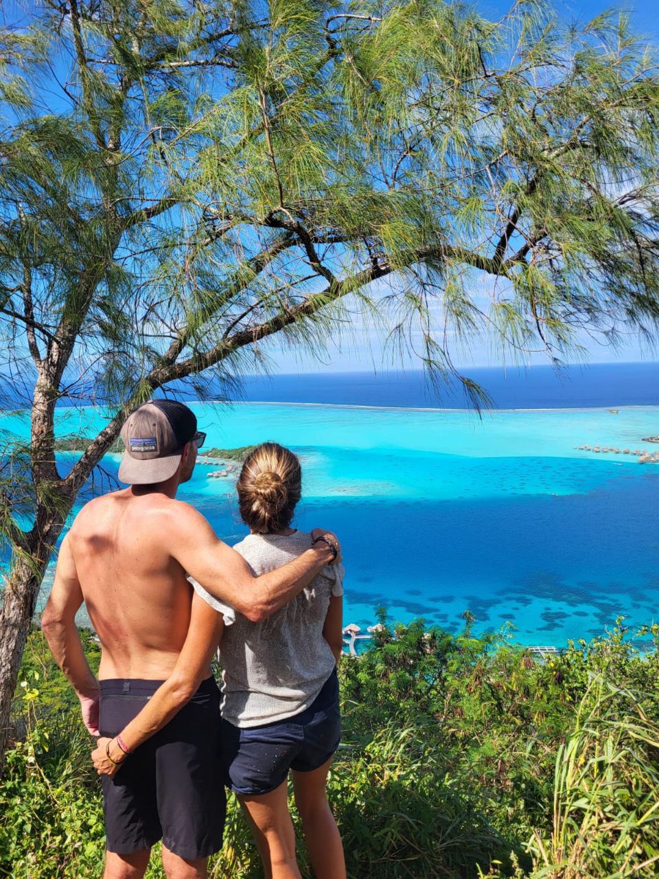 Dès notre premier jour, on part en rando avec Maxime et Pauline (comme mes neveux 🫶) qui logent au même endroit que nous, avec qui on a super bien accroché. Cette rando nous mène sur les hauteurs de l’île et offre une vue à 360°. On revoit notre notion des couleurs ; ce qu’on appelait jusque là du bleu turquoise était en fait du bleu émeraude. LÀ c’est turquoise. Les dégradés qui se dessinent selon la profondeur des fonds nous laissent sans voix. Même si la montée m’a fait souffrir !