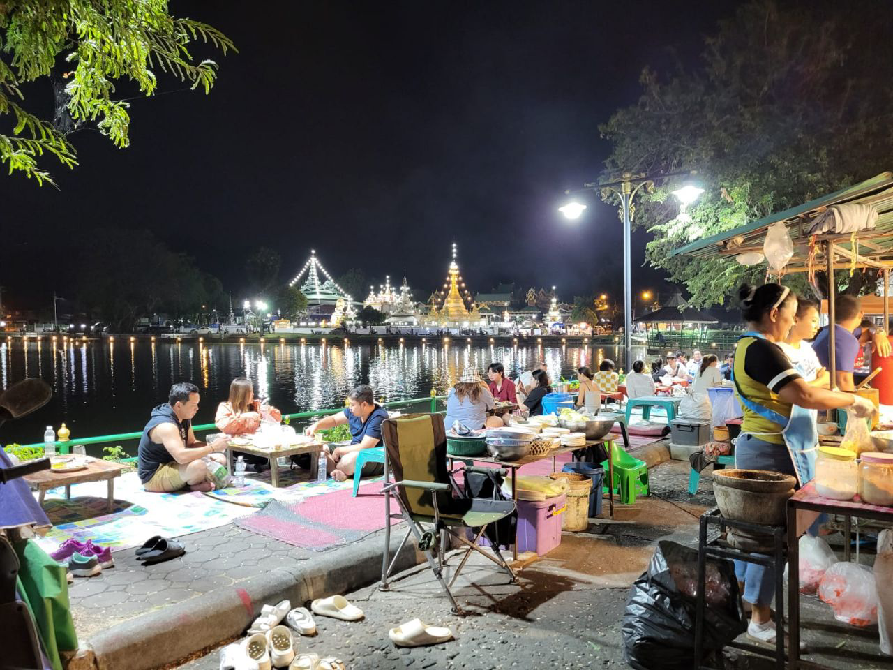 Lors de nos deux jours ici, le programme est léger : Visite d’un village Chinois à moins d’un km de la Birmanie (pas terrible, ça semble fake), pont tressé en bambou, et night market au bord du lac et des temples illuminés… On sympathise aussi avec un gentil chien de la street !